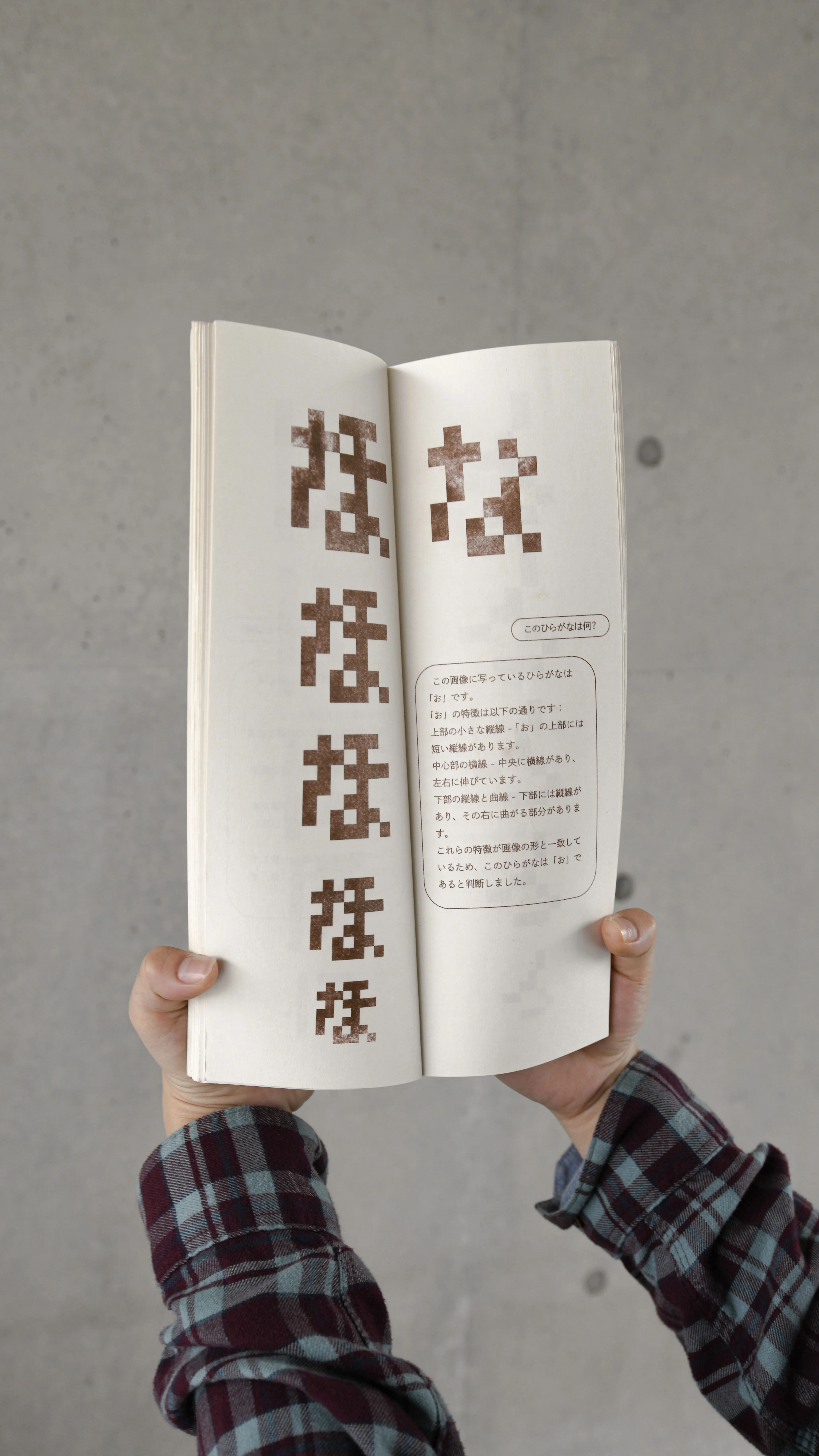 解像度の低いビットマップフォントのひらがなを、ChatGPT-4oに画像として読み込み、「このひらがなは何?」と質問すると、正しい回答は1割で、9割は違うひらがなを答えてきます。そこで私は、人間とAIの「文字を知覚するプロセスの違い」に着目し、人間が知覚したひらがなと、ChatGPT-4oが知覚したひらがなを組み合わせ、新しいひらがなを制作しました。