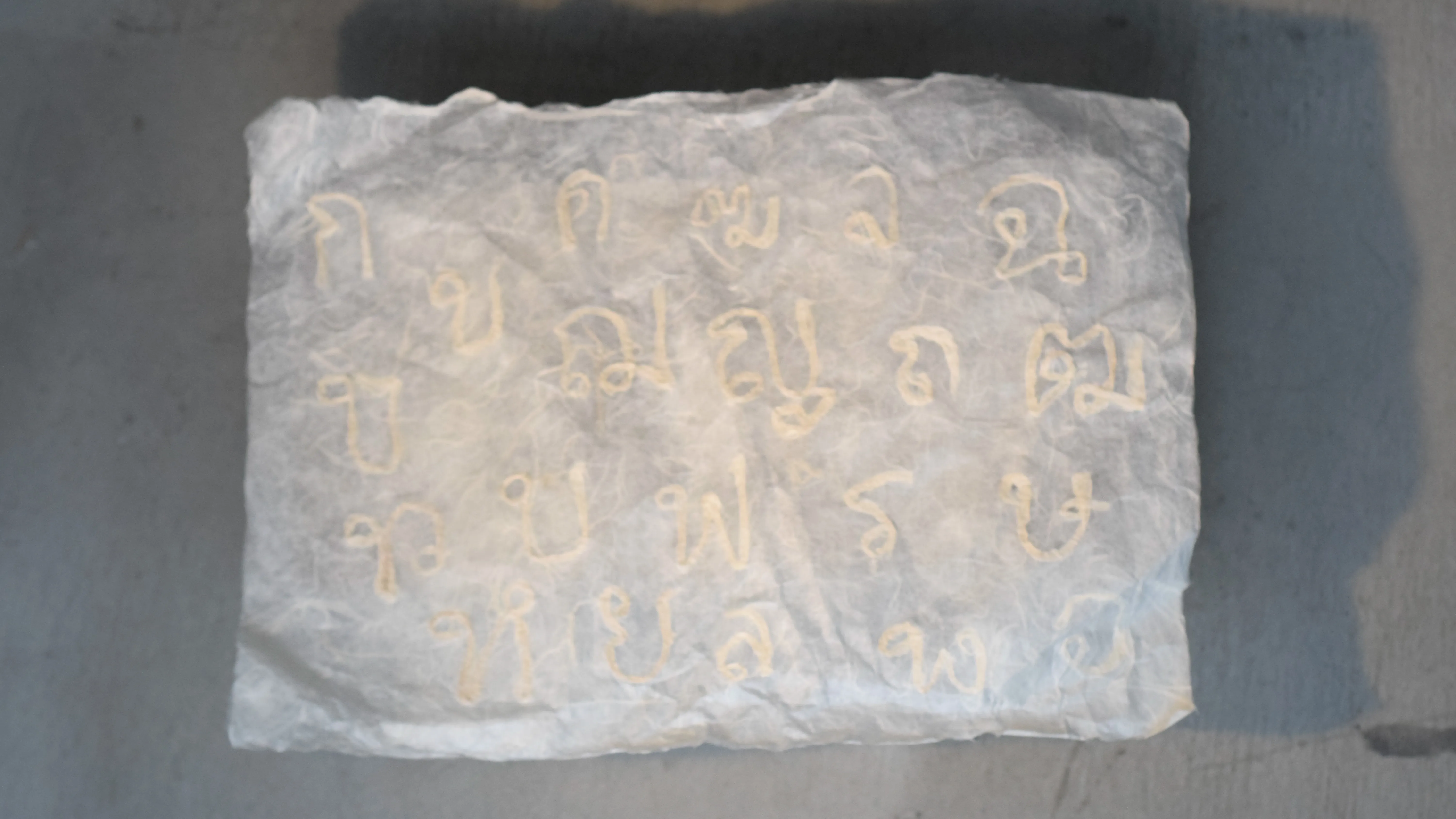 コウゾから和紙を漉き、繊維へと解体される前のコウゾを用いてタイ文字を書いた。
